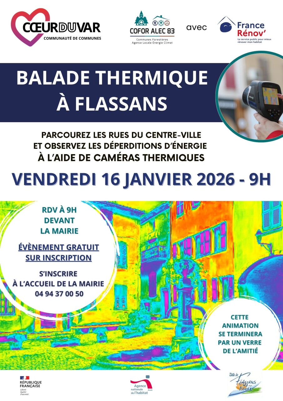 La Communauté de communes Coeur du Var et la commune de Flassans-sur-Issole vous invitent à la balade thermique organisée par la COFOR ALEC 83 le vendredi 16 janvier 2026 à 9h.